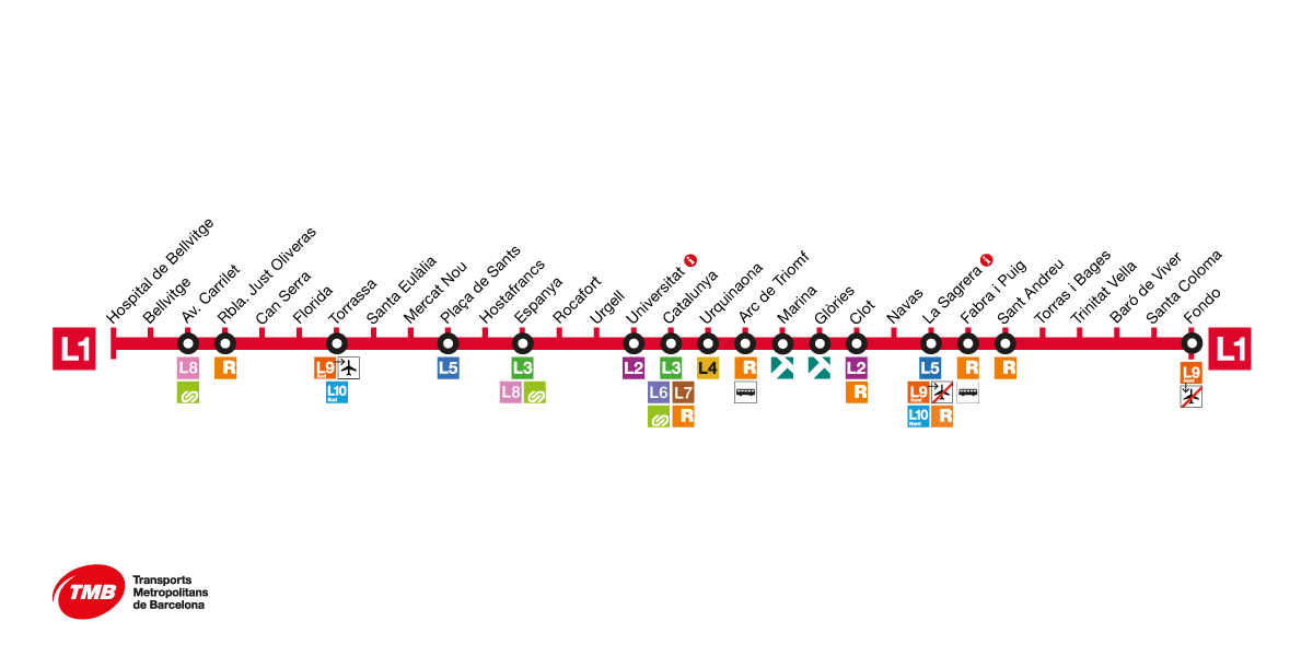 La línea roja del metro de Barcelona, la línea 1, conecta los municipios de Hospitalet de Llobregat, Barcelona, Santa Coloma de Gramenet y Badalona. A su paso por Barcelona, la L1 del metro, la línea roja, une los distritos de Sants-Montjuïc, Eixample, Ciutat Vella, Sant Martí y Sant Andreu.