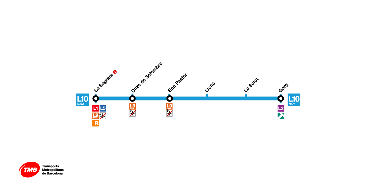 La línea 10 Nord, el tramo norte de la línea azul celeste del metro de Barcelona, conecta los municipios de Barcelona, Santa Coloma de Gramenet y Badalona.